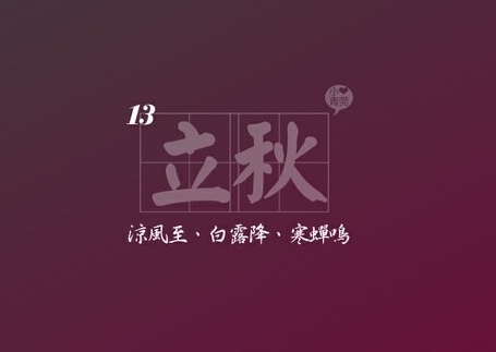 | 立秋,是二十四節(jié)氣中的第13個(gè)節(jié)氣,更是干支歷未月的結(jié)束以及申月的起始;時(shí)間在農(nóng)歷每年七月初一前后(公歷8月7-9日之間)。"秋"就是指暑去涼來,意味著秋天的開始。到了立秋,梧桐樹開始落葉,因此有"落葉知秋"的成語。從文字角度來看,"秋"字由禾與火字組成,是禾谷成熟的意思。秋季是天氣由熱轉(zhuǎn)涼,再由涼轉(zhuǎn)寒的過渡性季節(jié),立秋是秋季的第一個(gè)節(jié)氣。