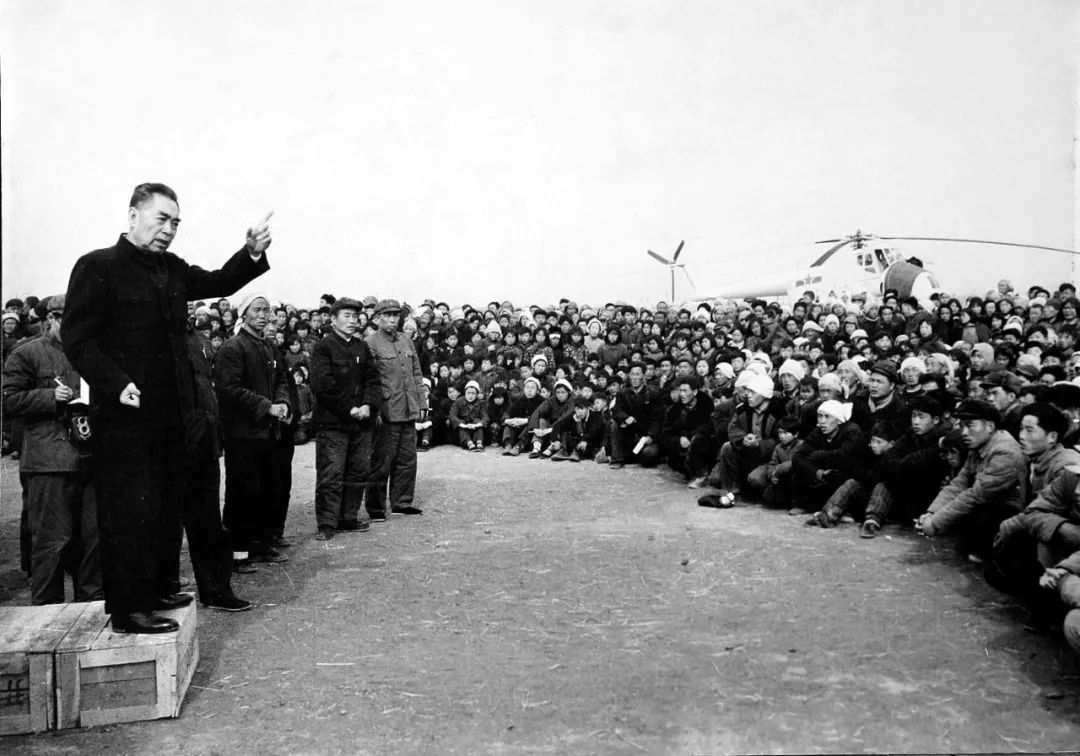 △1966年邢臺大地震,周總理對災(zāi)民發(fā)表講話。 讓群眾背風(fēng)坐 “ 1966年3月8日凌晨5時29分14秒,河北省邢臺市隆堯縣發(fā)生6.8級大地震。10日下午,周恩來親自前往受災(zāi)最嚴重的白家寨村。他一邊走一邊不時停下來跟群眾握手,說著:“鄉(xiāng)親們,你們受苦了、受驚了、遭災(zāi)了,我來遲了! 當(dāng)天刮著很大的西北風(fēng),可周恩來發(fā)現(xiàn)群眾都是面對西北風(fēng)而坐,原來縣委專門搭了一個坐北朝南的背風(fēng)講臺讓總理避風(fēng)。周恩來不同意,堅持改變布置,讓群眾背風(fēng)而坐,他自己迎著風(fēng)講話。 ——《周恩來風(fēng)采》 浙江出版聯(lián)合集團2016年版